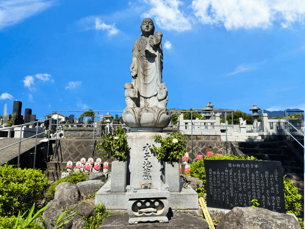 境内に建つ水子地蔵尊は、澄んだ青空と富士の山々を背景に、訪れる人々の心を静かに癒してくれる存在です。